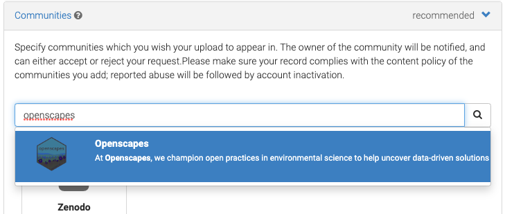 - The Zenodo Openscapes Community curator will be notified via email to approve inclusion of your record in the community.